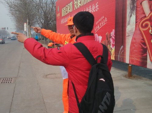 图为我“星火”实践团队员正在向环卫师傅问路