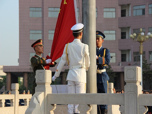 清晨一早学生们就来到广场前集合,神情肃穆,队列整齐,一起等待国旗升起那庄严的一刻。六时许,国旗在三名旗手的守护下出现在大家的视野中,随后而来的仪仗队身姿挺拔,神情气宇轩昂,步伐铿锵有力,无不向人们展示着作为我校国旗守护者的骄傲。在护旗手的护送下,国旗到达升旗台,国歌响起,升旗手有力的将国旗甩出,国旗在人们的注视中冉冉升起,迎风飘荡。