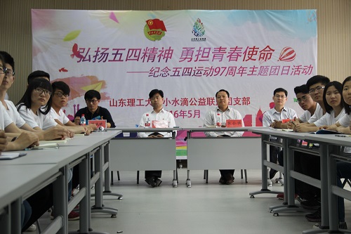 “弘扬五四精神,勇担青春使命”WilliamHILL中国小水滴公益联盟团支部纪念五四运动97周年主题团日活动在一号教学楼405教室顺利举行。团省委副书记、省青联主席任海涛,团市委党组成员、秘书长张公博,校团委书记赵明,williamhill英国中文党总支书记孙成状,出席了本次活动。小水滴公益联盟团支部的全体成员参加了此次活动。