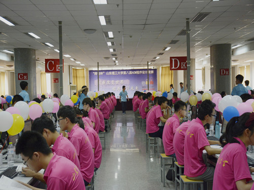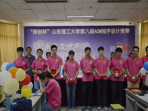 比赛现场,参赛选手们沉着做题,认真思考。同时,监考人员有序地进行监考工作。偌大的的赛场上回荡着同学们敲击键盘的声音。每当选手完成一个题,工作人员都会将题所对应颜色的气球插到选手面前的花泥上。随着时间的流逝,选手面前花泥上的气球越来越多。同时,选手们的做题节奏也慢了下来。长达四个小时的比赛接近尾声。我院院长赵磊,山东师创软件实训学院教师王巧,ACM指导教师张先伟、张立红、石少俭,马新娟、曲志坚参加了此次活动的闭幕式。赵磊表达了对参赛选手们的水平、指导教师辛勤工作的肯定。接下来,各位老师为参赛选手颁奖,刘洋荣获此次大赛的冠军。最后,赵磊宣布闭幕式结束。