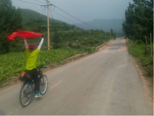 22日天气晴朗,是一个赶路的好时机,昨日因大雨行程有所耽搁,为了在计划之内完成任务,队员们都鼓足了动力前进。每爬过一个山峰,迎接队员们的是无比刺激的下坡,队员们就又振奋起精神,继续前进。行驶至一段较为平坦的路段,队长拿出了队旗,为了留下深刻的回忆,队长空手骑车,双手抓住队旗在路上驰骋。