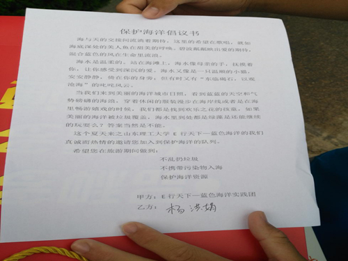 在了解到浒苔是因为富营养化而形成以及它的危害之后队员们意识到了宣传工作必须大力开展了,于是分配队员前往日照市东港区加印材料和新的宣传材料,店主在了解到实践队队员打印的目的时立马表态大力支持给我们复印材料只收成本价,这个心地善良的姐姐签署了协议书加入了蓝色海洋保护的行列,保护海洋真的需要很多像这样的人,你我共同努力一起爱护我的蓝色海洋!