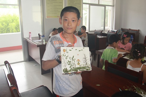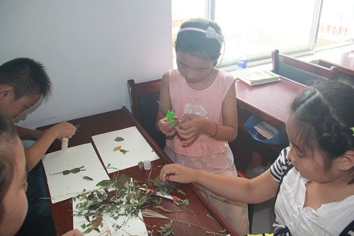 为激发学生的创意,提高学生的美术技能,8月15日上午,小水滴支教团安排了一节手工课,利用形状各异、品种不一的植物茎叶引导学生拼接成不同的图画来表现自己的精彩小世界。