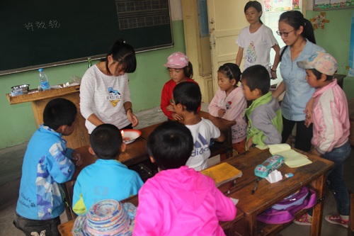 早上,队员们早早的来到教室,他们通过趣味教学的方式,将英语,数学,实验,魔术等知识分享给学生们,旨在用快乐的方式教会给学生最多的知识,他们通过有奖竞答的方式给学生以奖励,调动他们的学习积极性,队员们不但调动了学生上课的热情,而且还建立了双向的浓浓师生情。在许效锐老师讲授实验课上,实验会吸水的瓶子受到了广大小学生们的喜爱,实验进行时,当盆子中的水缓缓升入瓶中时,孩子们都发出了惊奇的欢呼,通过此次实验,让孩子们明白了空气的组成成份,激发了他们对以后学习化学物理的兴趣。在魔术课上,李兆杰的精彩表演让孩子们体会到了魔术的神奇,提高了他们的求知欲。课间休息时,队员们和孩子们一起唱歌,背诗,做游戏等活动,在活动中,队员们都表现出极高的工作热情,展现了大学生特有的奉献魅力,“学为人师,行为世范”,队员们用行动践行了“师者”的责任。各位队员根据实际开设的多充分种多样新奇而富有内涵的主题课堂,得到了孩子们的充分肯定。
