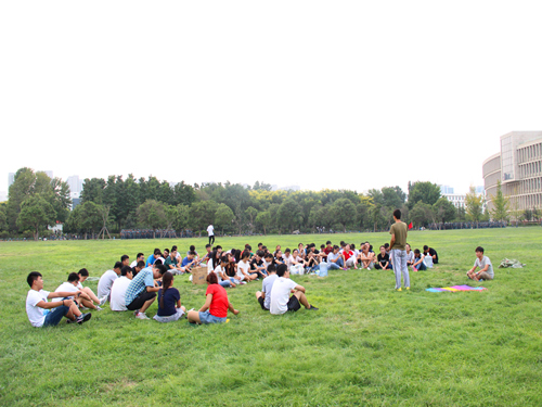 会议结束后,路广智带领大家在逸夫图书馆后进行素质拓展活动,活动开始前大家自行组队,完成组队后,队员之间相互熟悉,讨论确定属于自己队伍特色的队名、口号、队歌,并轮流展示以此鼓舞士气。展示过后,活动负责人带领大家进行一个又一个活动。活动中队员们,相互帮助、齐心协力,彰显了队员们朝气蓬勃、团结互助的精神风貌,最后活动也在一片欢声笑语中结束。
