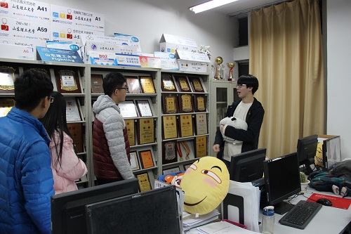寒冷抵挡不住同学们参观的热情。活动伊始,同学们进入实验室便感受的了电子信息化的氛围,实验室ACM集训队队员们整齐坐在电脑跟前,奋战编程,营造出了良好的学习氛围。随后,同学们进入实验室展厅进行参观,首先映入眼帘的是满满一面墙的各种奖牌,充分展示了学院重点实验室所取得的辉煌的科研成果。这些奖牌和荣誉激励着每一位队员积极进取的精神,它们不仅是对队员们的认可,更是为学校带来了极高的荣誉。负责讲解的集训队员详细的向同学们介绍实验室的发展历程,实验室的主要成员,实验室研究方向和所取得的科研成果。同学们都表现出极大的好奇心和学习的热情,针对实验室积极的提出自己的问题和想法,与讲解人员讨论交流。讲解的同学说道:“计算机这门学科,同学们在学习理论知识的同时,更需要增强动手实践能力,这样才能更深刻的理解和运用所学的知识。”ACM集训队队员们集训时熬夜奋战,比赛时团队团结协作,都展现了当代大学生吃苦耐劳的良好精神风貌。同学们认真参观,仔细听讲解,展现出同学们对ACM集训队的尊重与敬佩,同时,也增强了学习编程的信心。
