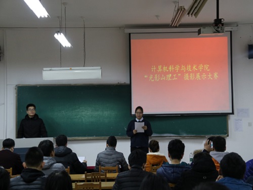 活动伊始,主持人介绍了此次比赛的具体流程,根据报名情况初步筛选并设置微信投票环节,最后选取微信投票前20名作品进入决赛。随后比赛正式开始。20名选手分为风景组和生活组两大组,分别展示了他们入围决赛的作品并对作品蕴含的意义或者是拍摄手法进行简单的讲解。风景组里一幅幅富有诗意的照片展示着校园的独特韵味:长廊的余晖,逸夫之都的夜景展现着校园的勃勃生机。接下来生活组的选手展示了校园生活丰富多彩的另一面:球场的月光,宿舍的庆生无一不展示了大学生活的多彩多姿。选手展示结束后,经过评委们仔细斟酌后的打分,共评出了一等奖两名、二等奖四名、三等奖六名以及优秀奖若干,随后,评委依次对获奖选手进行了颁奖并合影留念,在热烈的掌声中此次比赛顺利结束。