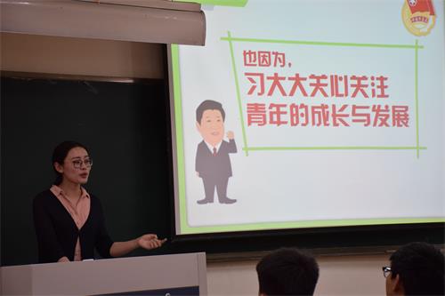 会议伊始,孔祥衫从“一学一做”的内涵出发,重点讲解“如何理解一学一做”。并联系自身经历,让学生们更好地理解“学是前提、基础,做是着力点、落脚点”。她还要求学生们,要坚定理想、要时刻发挥团员模范带头作用。接着,孔祥衫又从学习、组织生活、实践活动三方面,向同学们分享她对“一学一做学习任务”的理解。她鼓励学生们应该积极主动地自学先进思想,要多开展、多参加团日活动,发挥和彰显团员的先进性。并列举了一些相关的事例。随后,她提到习总书记的青年观,对习总书记提出的五个方面的重要要求展开详细地讲解。团课进行中,孔祥衫语言凝炼,富有表达力,举例充分。同学们反响热烈,积极回应。最后,孔祥衫列举了学校多位优秀学生,呼吁同学们要向他们看齐。