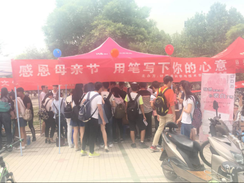 活动开始前,社联主席马志远、各部部长及社联骨干成员积极为本次活动做好准备,早早地来到三餐门口布置好桌椅、帐篷,整理好宣传海报等。场所布置好之后,鲜明的主题,温馨的歌曲立即吸引了众多同学们的注意,广大孜孜学子们踊跃参加,积极报名,现场一度出现一片火热,水泄不通的场景。负责此次活动的团内骨干热情的为同学们介绍本次活动,值得一提的是本次活动免费为广大学子提供明信片,同学们现场即可写下对母亲祝福的话语,志愿者团会在第一时间前往邮局邮寄,并尽量在母亲节当天将这份深深的祝福邮寄于你那温馨的港湾里。