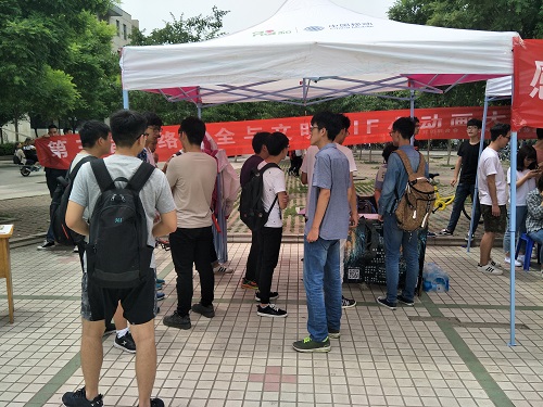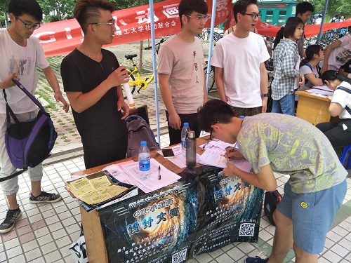有了上次的宣传经验,这次王全喜和协会骨干成员早已为宣传活动做好准备,提前来到事先已经选好的场地,早早的布置好场所,竖起的横幅、鲜艳的海报再一次吸引了众多同学们的注意。负责此次活动的协会干事一一热情的为前来报名的同学们讲解报名方式、参赛作品的要求和参赛的其他注意事项。为保证此次活动参赛成绩的公平性与公正性,网络爱好者协会的负责人将同学们的作品发布到微信公众号上,进行为期三天的投票,并根据微信投票的40%总名次,现场答辩的40%,以及评委打分的20%,来决定所得的决赛总成绩,最终胜出的同学将会获得校级证书以及精美的礼品。虽然这次的宣传前来报名的人不是很多,但是干事们并没有早早地结束宣传,依然用他们的热情去吸引更多的人。