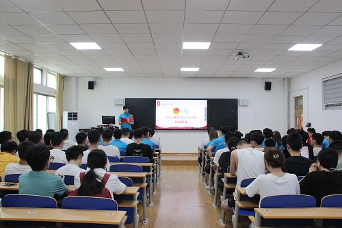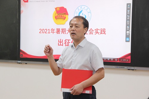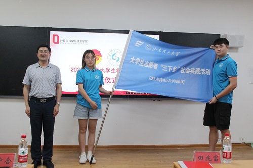 仪式伊始,孙明首先向大家介绍了2021年学院社会实践立项的情况以及实践中需注意的相关事项,并着重讲解了实践过程中报告撰写媒体宣传等方面的注意事项。随后,刘中合向精品实践团队代表授旗。紧接着,“E路先锋——赴延安实践团”学生代表陈家乐发言。她通过分享自己的实践的经验,倡导大家树立志愿服务精神,将专业知识与社会实践相结合。