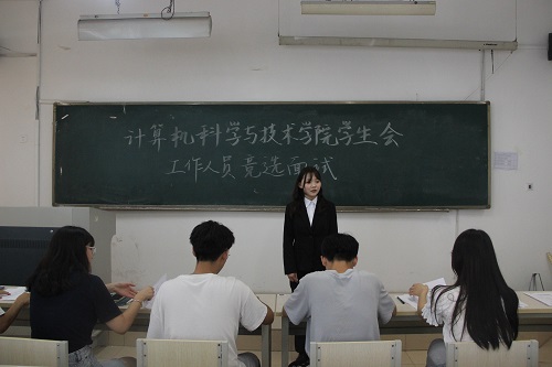 9月12日下午,计算机科学与技术学院在9号教学楼208室开展学生会工作人员竞选面试。计算机学院学生会主席姚增辉及学生会主席团参与评审,部分学生会常驻志愿者参加竞选。
