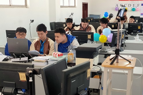 比赛开始之前,参赛选手陆续到达此次比赛场地。比赛负责人首先向参赛选手们宣布此次比赛的注意事项,然后再统一向参赛选手发放草稿纸用以演算算法。此次比赛采用组队的形式,每支队伍共用一台电脑,参赛队伍需在规定时间内采用C、C++或java等程序语言编写程序。当参赛选手们解决了一道试题之后,需将其提交给评测机,由评测机判断其是否正确。若提交的程序运行不正确,则该程序将被退回给参赛队,参赛队可以进行修改后再一次提交该问题。每通过一道题目则升一个对应颜色的气球,最短时间内解题最多的队伍获胜。此次比赛现场统一安装总监控摄像头,以维持比赛秩序,保证比赛的公平公正。考场内还安排了志愿者协助维护此次比赛秩序。比赛过程中,每一支队伍的成员都在积极讨论,比赛现场氛围紧张活跃。比赛结束后,评测系统自动对比赛进行评判和排名。