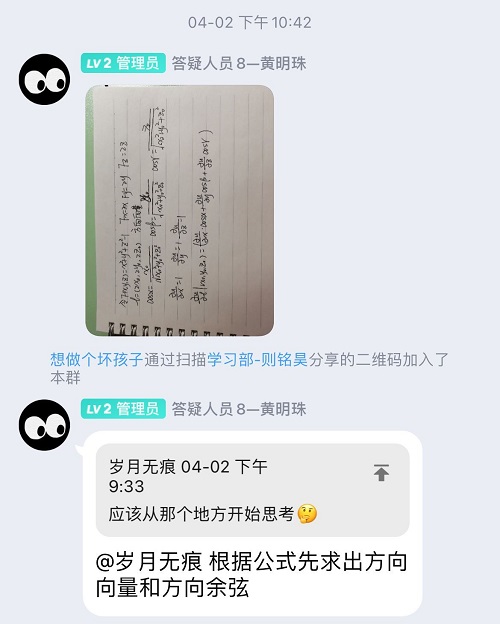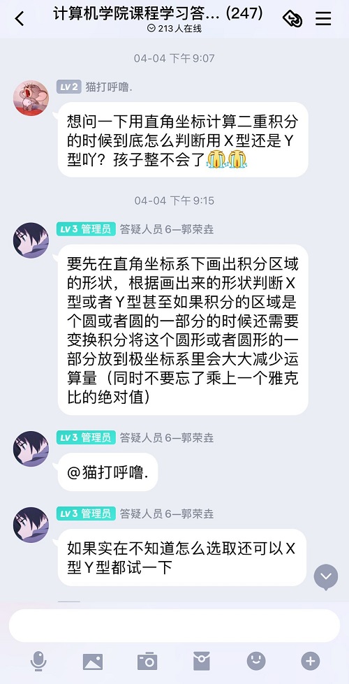 首先,计算机学院课程学习答题群已经正式上线。答疑人员由学习部的工作人员和以及各专业成绩优异的同学所组成。同学就自己遇到的学科难题在群里进行提问,并将晦涩难懂的题目和解法复杂的难题上传,答疑人员耐心仔细的回答。群内始终保持积极讨论、主动学习的氛围,答疑人员的讲解同时,同学也主动提出自己对问题的看法与见解,并在屏幕后进行二次学习,这有效地拓展了同学们的知识层面,打好学习基础。