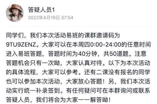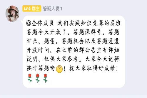 活动结束后,工作人员根据参赛同学的提交情况予以签到,并按照易班课群后台收集到的答题数据进行统计排名。活动负责人在QQ群内对此活动做出总结,并公布最终获奖名单。
