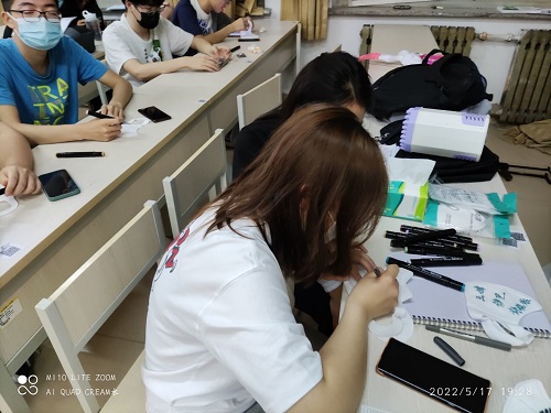 接下来,王婧带领同学们进行了DIY口罩活动,在白色的口罩上用画笔,画出自己在疫情期间抗疫的形象,或通过画笔为抗疫加油。活动中,团支部成员充满热情,认真作画,表达出自己的想法。最后,王婧带领同学们进行了你猜我画等娱乐活动,活动在热烈的氛围中收尾。