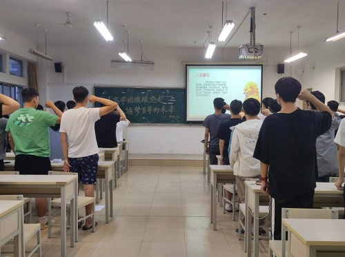 随后,王婧带领同学们进行重温入团誓词,唱响团歌,手抄团章活动,在宣誓过程中,同学们声音洪亮,将入团时的决心及加入中国共产主义青年团的信心在声音中又一次表现出来。宣誓完毕后,同学们表示深刻明确了自己作为团员应该承担的责任,将会不断提高思想道德素质,为成为一名合格的党员奠定基础。
