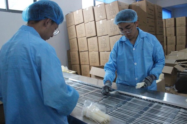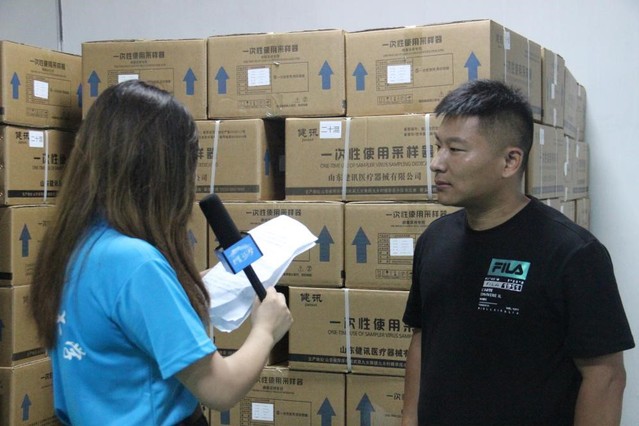 7月20日,团队前往九女口咽拭子生产工厂,展开采访学习工作。实践团成员在进行消毒过后,在工厂负责人的带领下,参观了口咽拭子包装的整个流程,工人将一次性使用采样器放在卡槽里,在自动化机器的操作下完成纸塑包装。包装完成后,再经人工检测达标,被送往储藏间。生产过程干净卫生,工人们严谨负责。