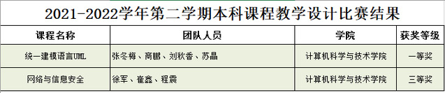 在10月6日结束的本科课程教学设计比赛中,我院张冬梅、商鹏、刘秋香、苏晶四位老师组成的《统一建模语言UML》课程团队获一等奖,徐军、崔鑫、程震三位老师组成的《网络与信息安全》课程团队获三等奖。根据《关于举办2021-2022学年第二学期本科课程教学设计比赛活动的通知》,本次本科课程教学设计比赛分院级、校级两个比赛阶段,校赛成绩由教学设计文本材料和现场说课评述两部分构成。