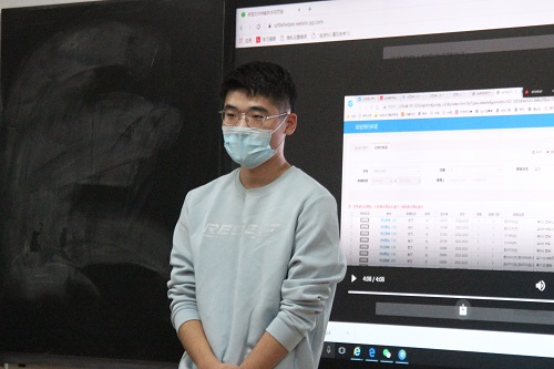 会议第二部分,褚天增通过实际操作结合视频讲解向同学们演示借教室流程,他强调申请借教室必须要用校园网登录教务系统,预约教室时必须详细填写预约原因且应正当合理,并且使用教室的单位应至少提前一天预约教室,等待教务处审核批准。学生骨干们专注听讲,记录下培训的重点内容。