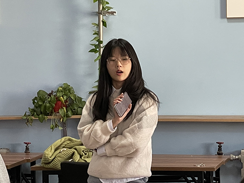 活动开始前,王靖雯向学生们表示欢迎并介绍了活动的相关要求。随后,她带领学生们进行热身小游戏,学生们抱着积极热情的态度参与其中。在“虎克船长”游戏开始前,所有学生围成一圈,记住所有人的名字。游戏随机选中一人开始,说自己的名字两次,然后再叫另一人名字,被叫到的人两边的朋友必须马上说:“嘿咻!嘿咻!”并做出划船的动作。重复这个过程直到有人做错,出错的学生需要接受惩罚。