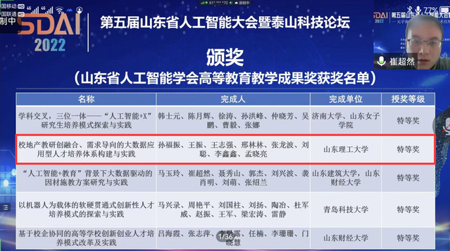 2022年12月11日,山东省人工智能学会公布了2022年山东省人工智能学会高等教育教学成果奖评审结果,我院孙福振老师团队申报的《校地产教研创融合、需求导向的大数据应用型人才培养体系构建与实践》获得特等奖。