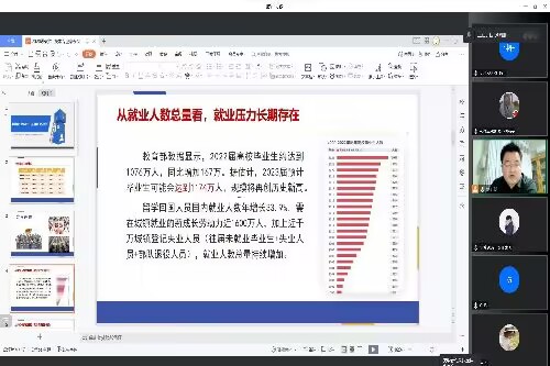 会议伊始,刘明卿阐明此次线上家长会召开的目的以及讲述的重点——20级软件工程专业、大数据专业学生毕业之后的人生道路规划以及如何踏实走好当下路。刘明卿根据各班收集的学生未来职业规划摸排表结合往届学生毕业方向选择指出,学生绝大部分选择直接就业、考公、考编或考研,并为家长分析各种选择的利弊。
