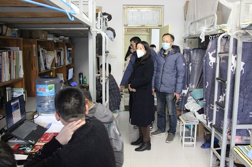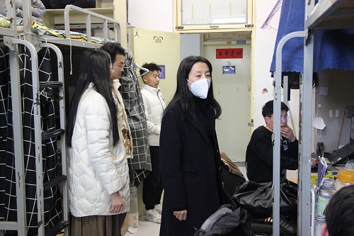 2月19日下午,williamhill英国中文党委副书记钟丽霞、学生工作办公室主任王超、辅导员刘岩、牛杰、汪茗惠走访6号学生公寓,看望慰问返校学生。