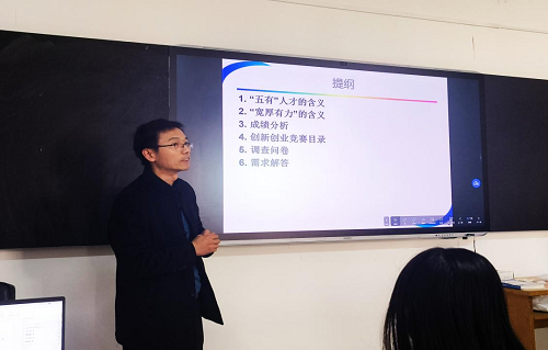 会议伊始,王绍卿确定此次会议主题,详细讲解主题“宽厚有力”的释义,激励同学们争做宽视野、厚基础、有想法、肯下力的人才。王绍卿根据上学期期末考试成绩,通过分段分析的方式,整体呈现班级的成绩状况,并对同学们的成绩提出殷切希望。他向同学们讲解创新创业竞赛目录,如,互联网+、ACM、蓝桥杯等竞赛项目,提出竞赛要求,激励同学们参加竞赛,为自己的未来发展提供支撑保障。同时,王绍卿对前期调查问卷进行详细分析,充分了解同学们的想法,积极解决同学们的需求。
