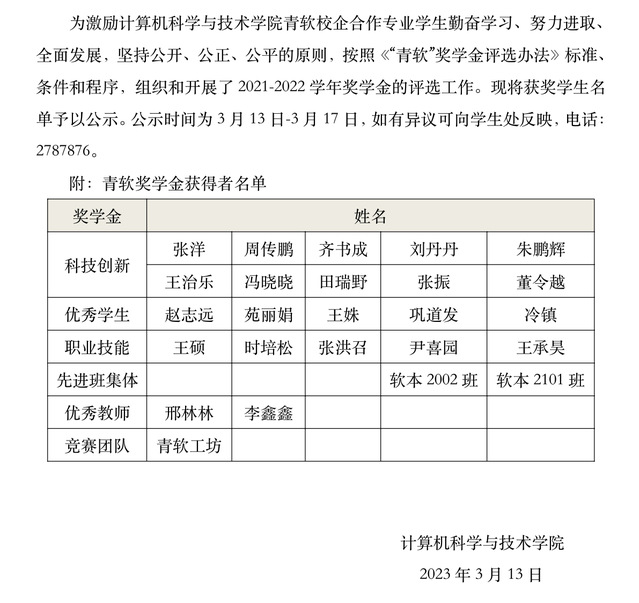 2021-2022学年williamhill英国中文 “青软集团”奖学金公示名单