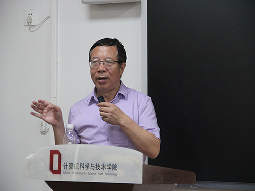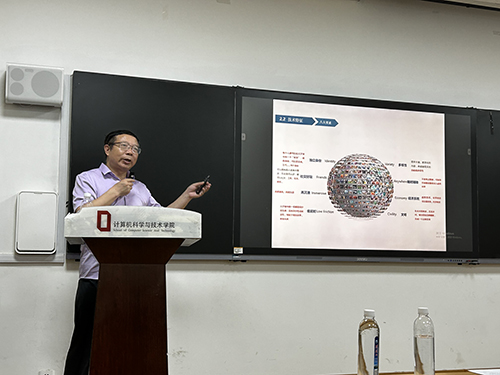 会议伊始,潘志庚向师生们简述自己的学术背景、工作经历以及在人工智能领域的研究成绩。他结合自身工作经验以及虚拟现实的研究课题经验,向与会人员论述了虚拟现实与人机交互的发展,并通过形象生动的视频与图片,从元宇宙的六大核心要素入手,详细地介绍了包括区块链技术、交互技术在内的元宇宙的六大核心技术。随后,他对元宇宙的概念、构成和发展趋势进行了深入阐述,在他所总结出的关于元宇宙研究的八大观点的基础上,介绍了虚拟现实、增强现实等科技技术,阐明了元宇宙技术在数字领域的重要性和应用前景。