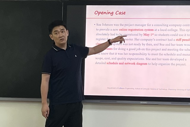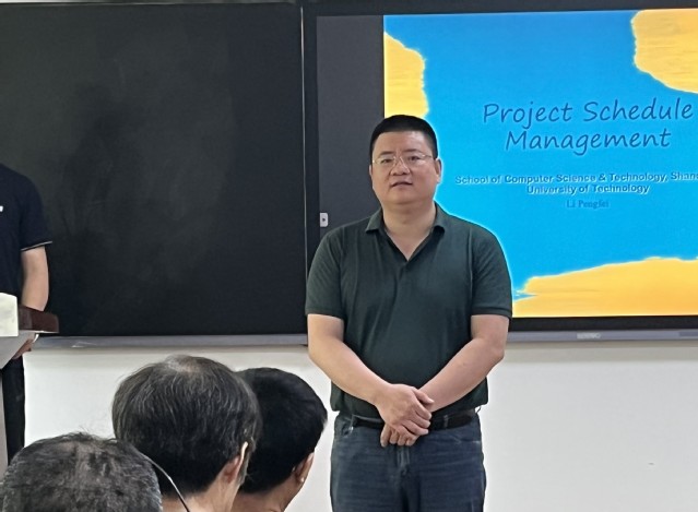 本次考核,李鹏飞老师进行了20分钟的现场试讲,讲课内容选自《IT项目管理》第六章项目进度管理的一节课程内容。试讲中,李鹏飞老师精神饱满、准备充分,讲课内容条理清晰,台风稳健,表现出扎实的专业知识储备,充分展示了青年教师的课堂风采。
