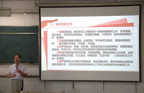 接着,田兆富对学院意识形态工作进行部署,对全院教工提出五点要求。一是意识形态工作是党的一项极端重要的工作,关乎道路、政治安全,全院上下要高度重视,不能存在思想观念、思想意识偏差,不能存在“重业务轻思想工作”的倾向。二是加强课堂教学管理,认真落实“学术研究无禁区、课堂讲授有纪律”,真正做到不信谣、不传谣、不造谣。三是严格论坛、讲座、研讨会、报告会等会议活动的审批,定期排查社团活动、学术沙龙、对外文化交流活动等方面存在的风险隐患。四是坚守网络意识形态阵地,特别是课堂、网站及微信公众号等,创新传播政法领域正能量,大力支持、积极鼓励“红色内容”,让意识形态工作进一步推进。五是严禁师生在校园内传播宗教、参加宗教活动、散发宗教类出版物及宣传品等行为,切实做好信教团员的转化工作和少数民族学生的管理工作。