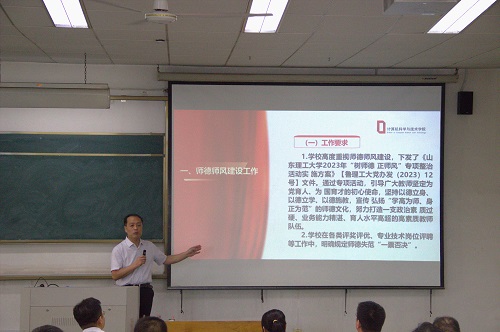 首先,田兆富对学院师德师风建设工作进行部署。他强调学院高度重视师德师风建设,扎实开展“树师德 正师风”专项整治活动,邀请山东大学神彦飞教授做“涵养师德、以德育人”报告,在学院走廊和教师办公室悬挂“新时代高校教师职业行为十项准则”“四有好老师”等内容的宣传板,营造师德师风工作氛围。同时,学院在各类评奖评优、专业技术岗位评聘等工作中,明确规定师德失范“一票否决”。