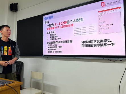 孙美源学长同样为同学们分享了他的国奖答辩经历,学习方法等,给同学们提供了一些相关方面的注意事项,同时鼓励同学们积极参加社会实践,丰富人生阅历。