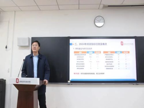 王雷从2024年学校部署的工作任务、科学研究与服务社会、学科建设与研究生培养三方面进行讲解。他提出,2024年是学校“人才工作突破年”,在学校党委四届四次全委(扩大)会议暨工作总结部署会精神的指引下,要在学院内大力推进优势学科强化战略,深刻落实开展有目标、高效率、高层次的科研工作,强化资源思维,加强科研队伍建设与学科建设。同时,王雷还就2024年国家自然科学基金申报进行了讲解。