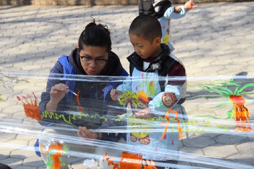 活动最后,志愿者和小朋友们一起欣赏了保鲜膜上的大树,并在大树前拍照留念。
