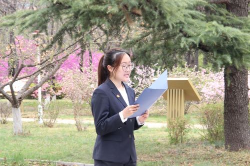 随后,冯思广精神学习宣讲团成员韩佳滢致祭奠词,回顾英雄的事迹,表达对英烈的深切敬意和崇高的追思之情。她详细讲述了冯思广精神所蕴含的价值和意义,呼吁同学们珍惜当下幸福生活,珍爱和平环境,传承先烈的革命精神,为实现国家富强、民族复兴而努力奋斗。同时她号召全体山理工人牢记使命、追求卓越,在冯思广精神的指引下,增强爱党爱国、爱校荣校意识,实现德智体美劳全面发展,努力成长为有益于国家、有益于人民的人。