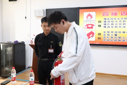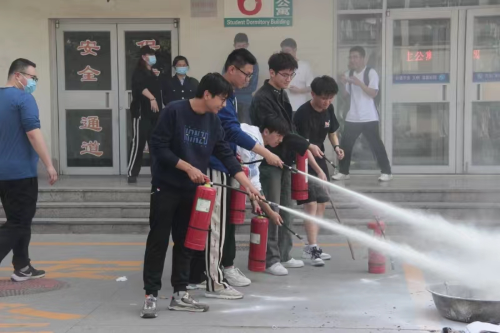 火灾疏散逃生演练结束后,乔晓老师针对如何正确使用灭火器开展现场教学,重点强调了干粉灭火器使用方法,灭火时,灭火人员应站在上风处,按照“一提、二拔、三握、四喷”的操作要领,组织学院师生现场实操,亲自感受、体会灭火器的灭火功效。