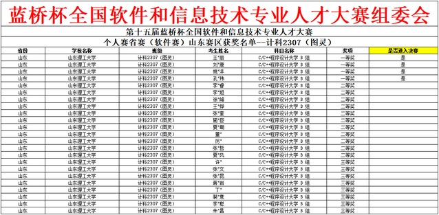 第十五届蓝桥杯全国软件和信息技术专业人才大赛(以下简称蓝桥杯)于4月13日成功举办。竞赛结果于4月29日正式公布。我院计科2307(图灵班)报名27人,获奖23人(其中省一等奖4人,省二等奖11人,省三等奖8人。);计科2207(图灵班)报名34人,获奖32人(其中省一等奖11人,省二等奖14人,省三等奖7人。),成绩优异,可喜可贺。获得省一等奖的同学将于2024年6月1日参加全国总决赛。