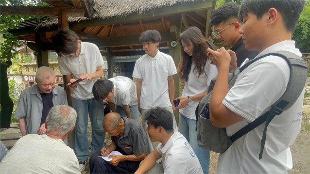 实践团成员拜访了几位村中老人,乡民们或坐或立,在村中树下尽情享受生活。其中一位老人吸引了实践团成员的注意。这位八十八岁的老人提笔为实践团成员写了一副字联,字里行间透露出岁月的沉淀与文化的韵味。实践团成员静静地观赏他们书写,不时发出赞叹之声。随后,老人们还耐心地向实践团成员传授书法技艺,讲解字体的结构与运笔的方法。这次交流让实践团成员深刻感受到了中华书法的博大精深,也让实践团成员更加珍惜和尊重乡村中的传统文化遗产,实践团成员体悟到了文化在乡村振兴中的重要作用。