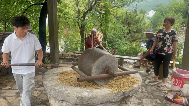 实践团深入农户家中,与村民们亲切交流,了解村民的生产生活情况以及对未来发展的期望。实践团成员帮助村民用石磨产出小米。在村民的指导下,实践团成员亲手操作笨重的石磨,将金黄色的谷子缓缓磨成细腻的小米。在实践过程中,实践团成员不仅感受到了传统农耕文化的魅力,也深刻体会到了农民劳作的艰辛与不易。通过这一活动,实践团成员意识到现代农业技术虽已普及,但传承和保护传统农耕文化同样重要,它是乡村文化自信的源泉。实践团成员感受到了淳朴的乡民情谊,村民们纷纷表示,近年来在政府的支持和帮助下,村里的产业得到了快速发展,大家的生活水平也有了显著提高。同时,村民也希望未来能够继续得到政府的支持和帮助,让“一村一业”的发展模式更加成熟和完善。