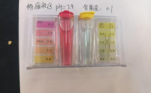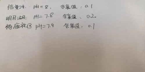 此次取得的黄河水质样本来自东营市杨庙社区、明月湖和垦利县黄河流域沿岸。实践团首先对所取得的三种样品进行了PH值和余氯值测量,经测量发现三种水质样品PH值都在7.9左右,明月湖位置处水质样品余氯值为0.2mg/L,其余两种样品的余氯值均为0.1mg/L。经分析三处取样点的样品余氯值均远低于国家标准规定的的2mg/L,由此可见我国黄河流域生态保护和治理的成果之显著。