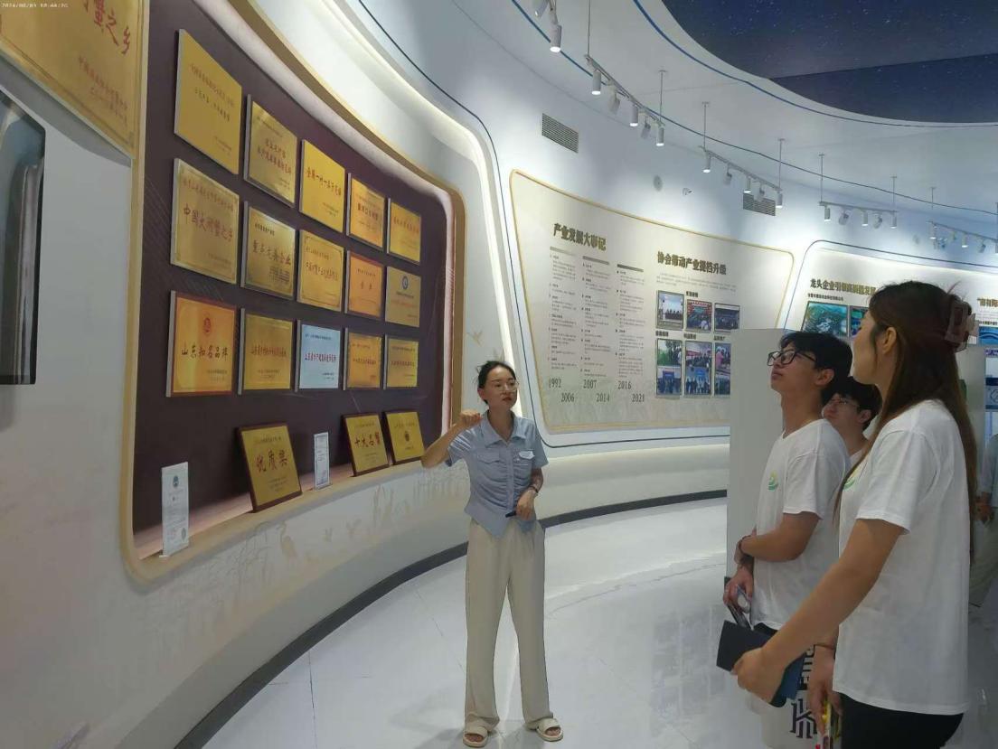 跟随讲解员的脚步,实践团成员了解到黄河口大闸蟹产业的发展现状、扶贫活动以及利益联结机制的构建。讲解员指出,产业园与当地扶贫活动紧密结合,通过建立“协会+龙头企业+合作社+农户”的利益联结机制,有效推动了贫困地区的经济发展。讲解员也深入讲解了“1+5+N”模式的实施细节,该模式通过统一苗种、技术、物资采购、品牌营销和技能培训,构建了完整的产业链条,农民不仅享受到专业的技术指导,还能在品牌推广中受益,实现增收。听取讲解的过程中,实践团成员还了解到,企业的扶贫活动促进了村集体经济的发展,通过大闸蟹产业的带动,村集体的收入显著增加,为当地基础设施建设和公共服务提供了资金支持。通过此次参观,学生们深入了解了大闸蟹产业的现状与发展潜力,他们纷纷表示将以此为契机,关注并参与到乡村振兴的实践中。