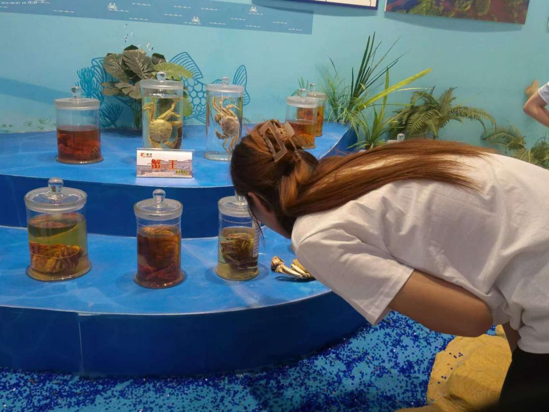 进入展馆,通过图文并茂和参观实物的方式,在讲解人员的带领下,实践团成员了解到了黄河口大闸蟹的独特性。在大闸蟹众多的品系中,黄河系大闸蟹以其特有的生长条件脱颖而出。首先,其养殖环境引用了黄河水,讲解员介绍,这种在盐碱地的特殊环境下形成的强碱性生态水质,为黄河口大闸蟹的独特性打下了基础;其次,位于北纬37℃的特定气候区域,为黄河口大闸蟹提供了得天独厚的生长条件,使得大闸蟹的生理机能得以充分发挥,也使得其肉质更加鲜美;更为引人注目的是,黄河口大闸蟹肌肉中的脑黄金含量高于其他品系的大闸蟹。脑黄金是人体必需的脂肪酸,对维护心脑血管健康、促进智力发展具有重要作用。这一发现进一步证明了黄河口大闸蟹的独特性和营养价值。通过在大闸蟹产业园对于黄河口大闸蟹的了解,实践团成员不仅增强了对地方特产的认识,也更加深入了解到黄河带来的种种便利与优势。
