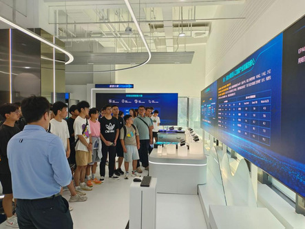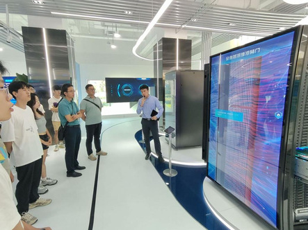 讲解员重点介绍了全液冷机柜,全液冷机柜可以通过冷板及全自然冷液冷背门可实现100%液冷散热,无需空调散热,单机柜最高支持100KW功耗,一柜顶十柜。讲解员通过讲解以及与同学们的互动,带大家切身了解了此项前沿技术,同学们表现出极大兴趣。