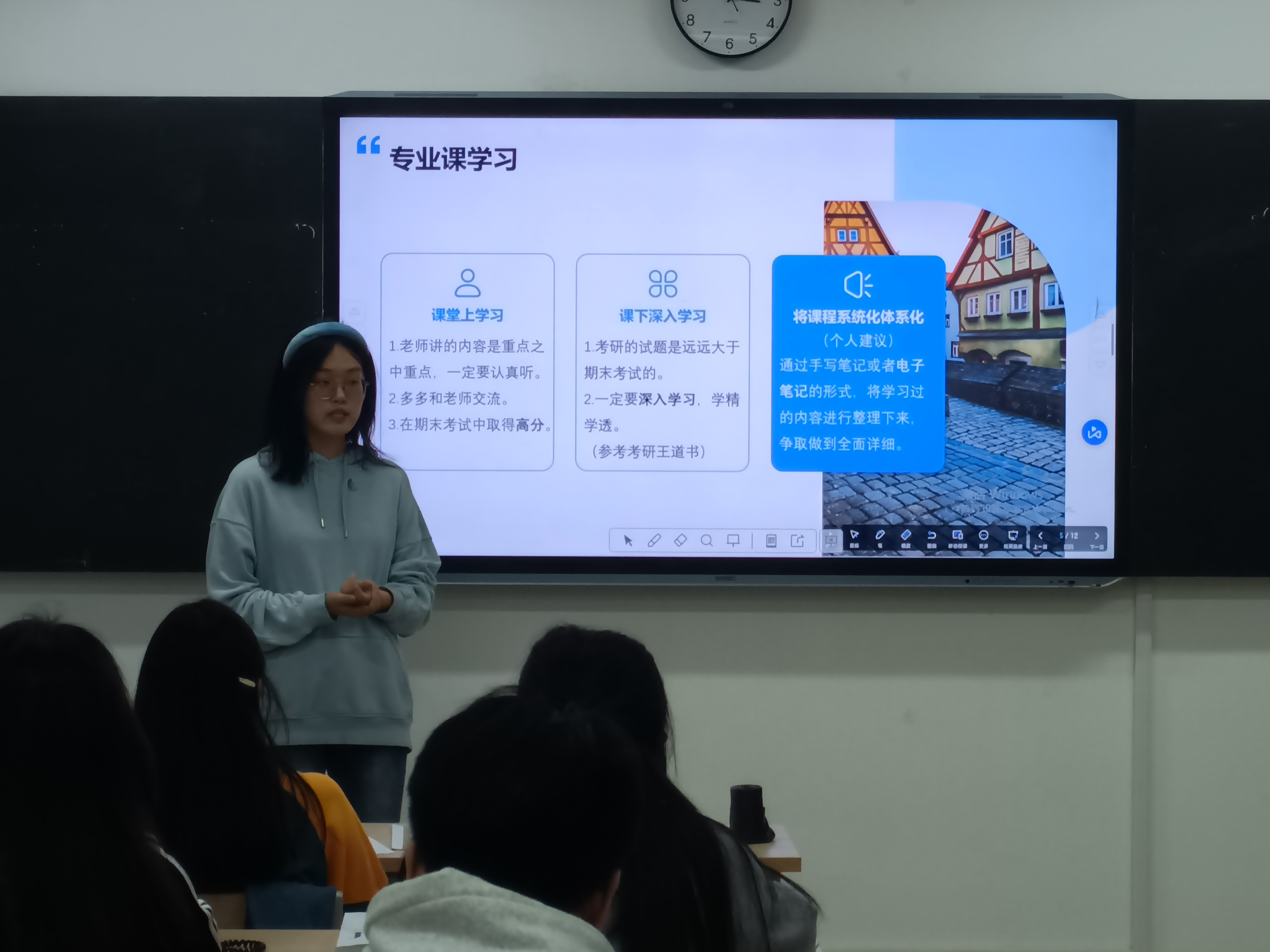 首先由张思萌进行分享。张思萌主要从专业课学习、英语四六级和参与竞赛科研三方面进行了学习经验的分享。其中专业课学习方面涉及到了许多有关考研的内容。张思萌说,要将课堂上学习和课下深入学习结合起来。她建议对专业课知识进行笔记整理。对于英语四六级方面,张思萌还分享了一些个人总结的小建议,有关听力、阅读等重要方面,对同学们帮助很大。
