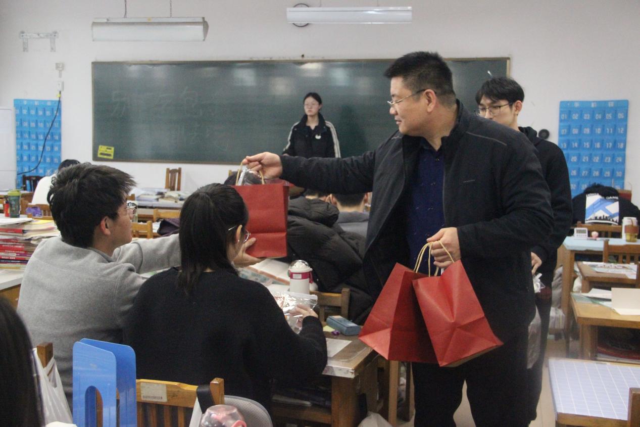 钟丽霞、孙福振将承载学院满满祝福的精美考研助力礼包送到每一位考研学子手中。礼包中不仅有应试所需文具,还有写着“旗开得胜、青云直上、全力以赴”等祝福的卡片、热敷暖贴和寓意“柿柿如意”的纸巾等,这些暖心的礼物不仅承载着学院师生对考研学子的殷殷期望,更体现了学院与考研学子心连心的深厚情谊。