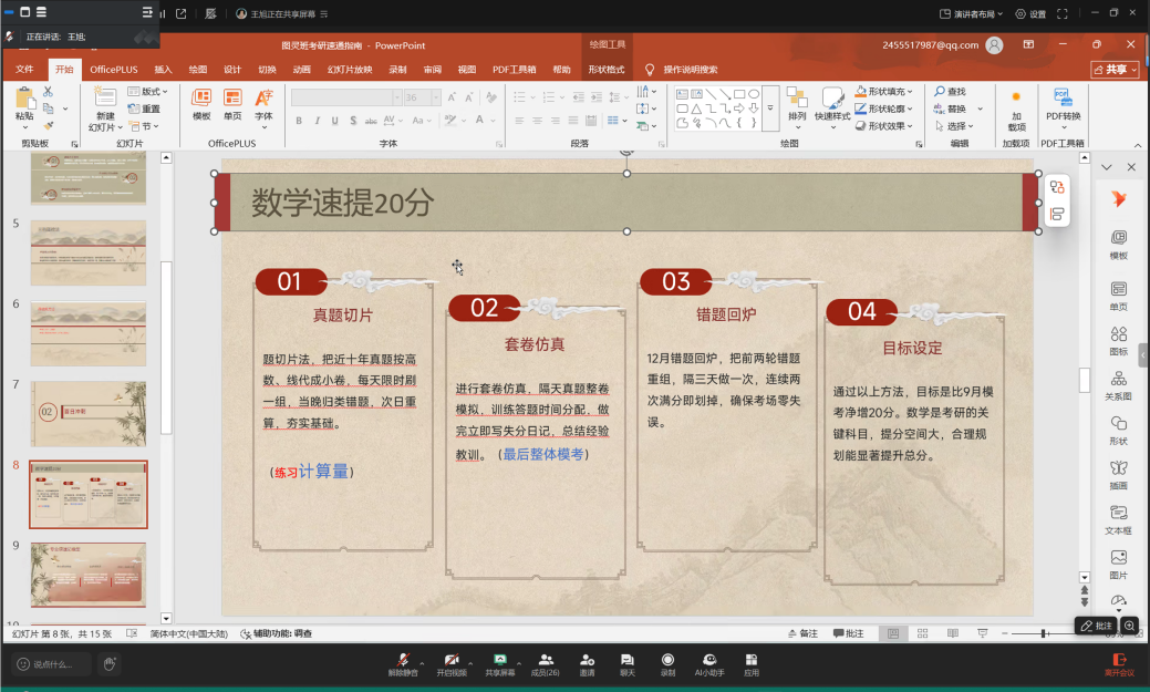 针对复习方法,王旭分享了数学快速提分策略,包括通过“真题切片”训练熟悉题型、通过“套卷仿真”模拟考场状态,以及重视“错题回炉”和合理设定分数目标。在专业课上,他建议采用“核心模型梳理+口述复述+命题人视角训练”的方式深化理解。此外,他也提醒同学们重视英语和政治的“保底”复习策略,确保各科均衡发展。