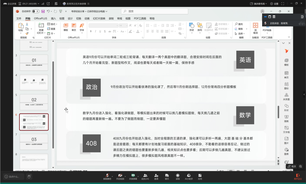 陈常萍学姐则从复习进度与时间管理角度给出了细致建议。她指出,9月份是强化阶段的关键节点:数学应进入强化课程学习与模拟训练,并保持每日错题重做;408专业课则需系统跟课、反复巩固基础与套路,尤其要重视真题训练而非盲目刷模拟题。